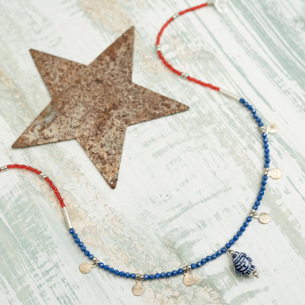 This necklace is inspired by Es Portixol, a former fishing village and now a smart little port with boats and colourful buildings lining the promenade. It features a carefully considered combination of glass, Czech crystal and metal beads interspersed with five small upcycled metal discs, with a central blue and white porcelain fish pendant.