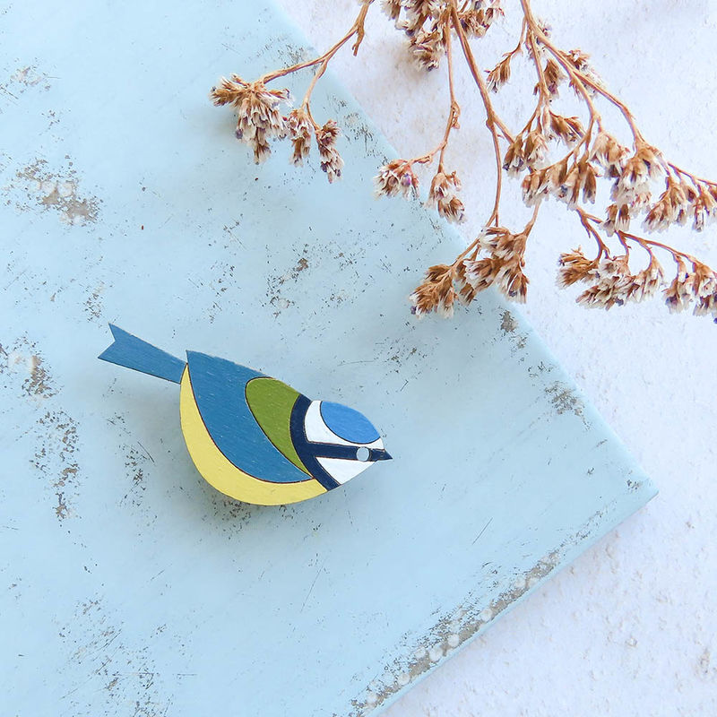 The charming little blue tit is the inspiration for this brooch design. It is cut from FSC certified sustainable birch and painted entirely by hand using eco-friendly Farrow and Ball colours. The back of the brooch is painted a mustard yellow and both sides are finished with a satin varnish.