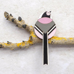 The little fluffy teaspoon of a bird that is the long tailed tit is the inspiration for this brooch. It cut from FSC certified sustainable birch and painted entirely by hand using eco-friendly Farrow and Ball colours. The back of the brooch is painted in a soft pale green and both sides are finished with a satin varnish.