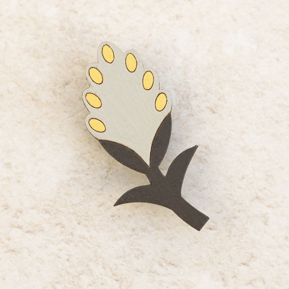 The flower range has been specifically designed to be worn either alone, with another flower or to be paired with one of the Shark Alley bird brooches as a kind of perch for the bird, or to complement or contrast with it in terms of shape or colour.