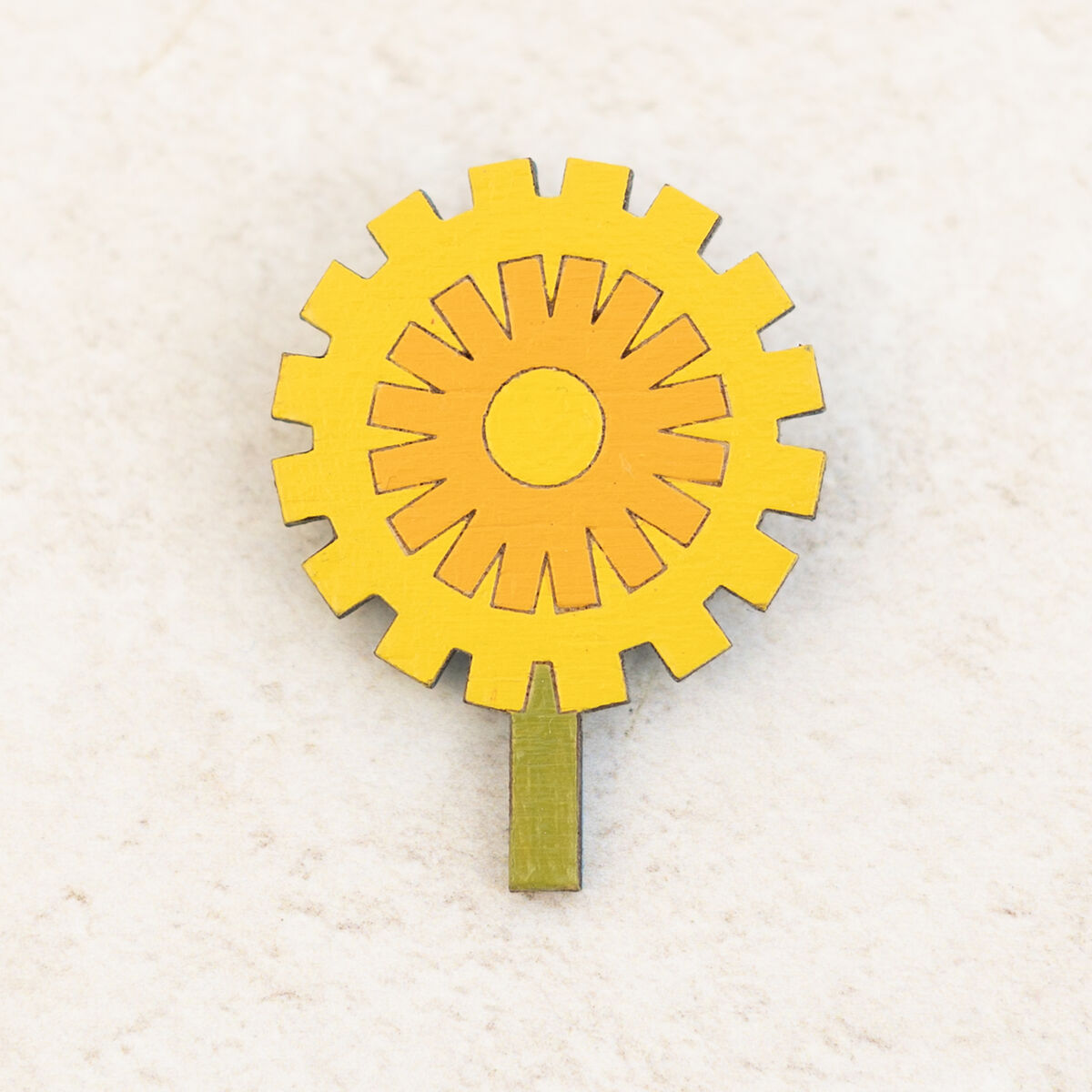 This brooch is based on the cheerful dandelion, often overlooked as a weed but in reality a pretty, sunshine yellow flower with complex layers of petals and a gentle fragrance redolent of summer.