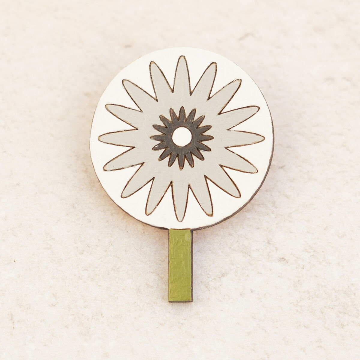 The dandelion is cut from FSC certified sustainable birch and painted entirely by hand using water-based eco-friendly paint. The back of the brooch is painted in marigold yellow and both sides are finished with a satin varnish.