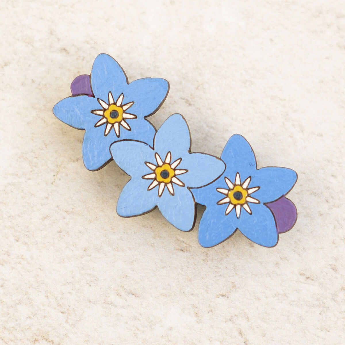 The forget-me-nots are cut from FSC certified sustainable birch and painted entirely by hand using water-based eco-friendly paint. The back of the brooch is painted leaf green and both sides are finished with a satin varnish.