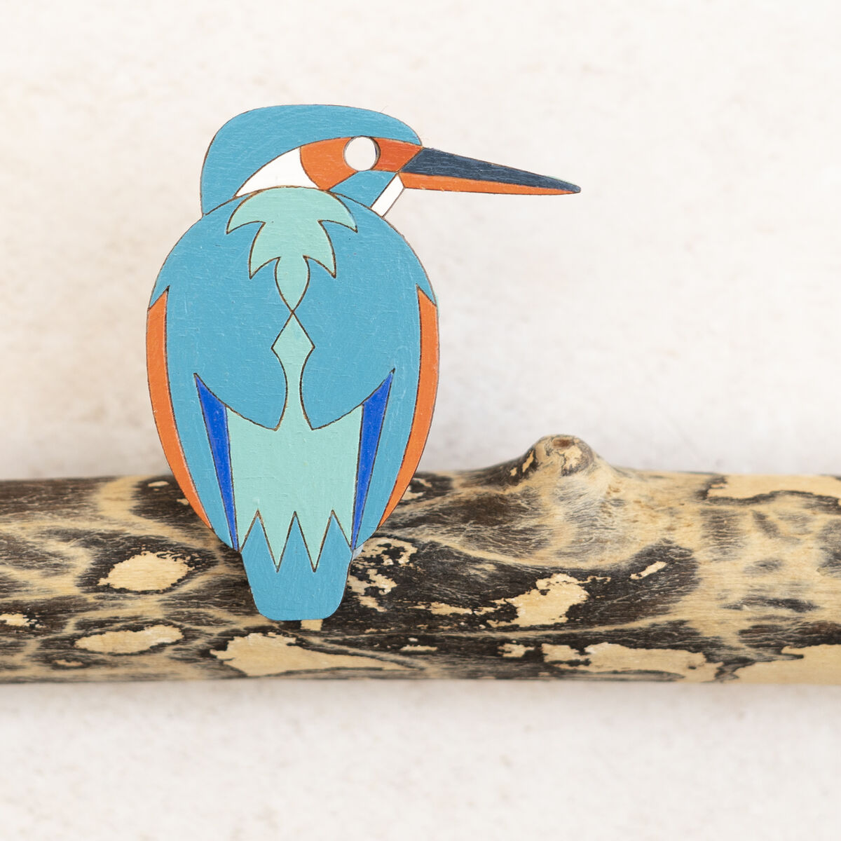The brooch is cut from FSC certified sustainable birch and painted entirely by hand using water-based eco-friendly paint. The back of the kingfisher is painted in a bright electric blue and both sides are finished with a satin varnish.